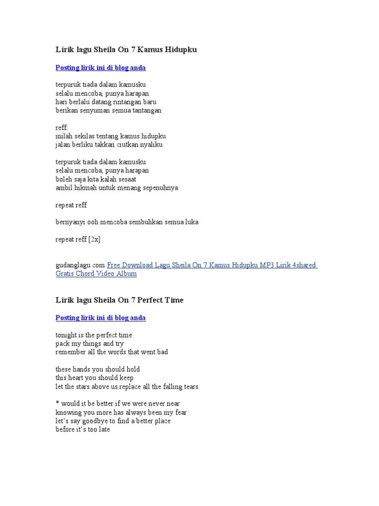Kumpulan 9 Lirik Lagu Sheila On 7 Kita. C em dm g c disaat kita bersama. E7 dm diwaktu kita tertawa, menangis. Jika kau rindukan gelak tawa G c f g merenung oleh cinta. Kau t'lah percikkan rasa sayang.